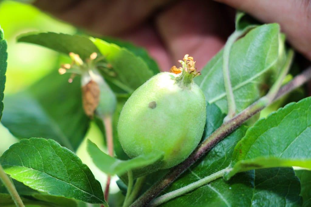 Tomasz Gasparski omówił także stan porażenia jabłoni parchem i mącznikiem jabłoni oraz przedstawił możliwy scenariusz ich dalszego rozwoju. W przypadku parcha jabłoni intensywne wysiewy zarodników workowych i silne infekcje (według modeli chorobowych) miały miejsce od 28 kwietnia do 1 czerwca. Zapisy dokonywane przez urządzenia matematyczne pokrywały się z odczytami ze Spor Trapów (łapacza zarodników workowych grzyba Venturia inaequalis). Obserwacja mikroskopowa otoczni grzyba w zeszłorocznych liściach daje podstawy sadzić, że około 7% zarodników workowych nadal w nich się znajduje. Są one dojrzałe i gotowe do wysiewu. Zatem deszcz może sprawić, że nastąpi ich wysiew. Należy zatem nadal brać to pod uwagę prowadząc ochronę przed parchem jabłoni. Ponadto na liściach (fot. 6) i zawiązkach (fot. 7) zaczynają się pokazywać plamy parcha z wcześniejszych infekcji. Świadczy to o konieczności przeprowadzenia dokładnej lustracji oraz o prowadzeniu dalszej ochrony.