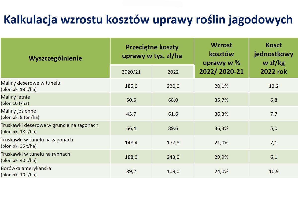 W pierwszej kolumnie po prawo widzimy natomiast jednostkowy koszt wyprodukowania każdego kilograma w zależności od gatunku i technologii uprawy. Widzimy ciekawą prawidłowość. Najniższe procentowo wzrosty kosztów produkcji dotyczą najdroższych (w wyprodukowaniu) gatunków, czyli malin deserowych w tunelach i borówek.