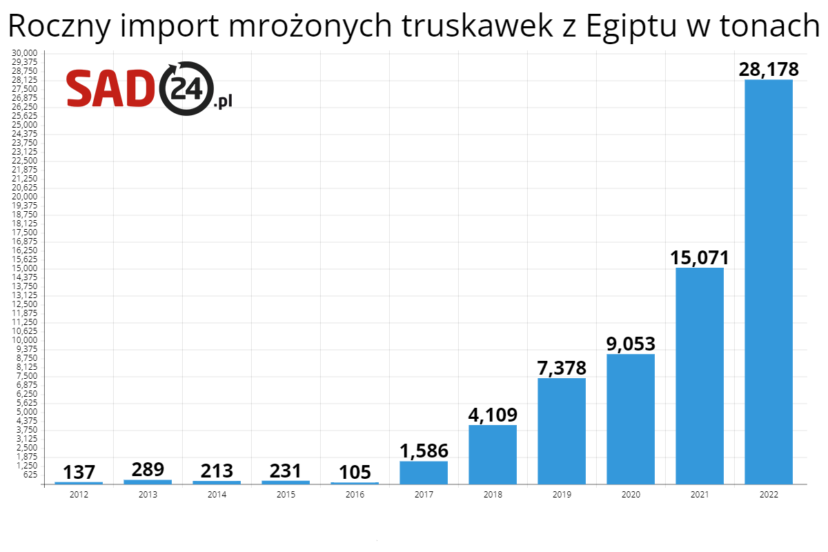 Obok mrożonych malin ustanowiliśmy w 2022 roku kolejny rekord. Chodzi o import mrożonych truskawek. Jak widzimy na wykresie niżej, każdy kolejny rok od 2017 jest pod tym względem rekordowy. W 2022 sprowadzono do Polski ponad 28 tysięcy ton produktu i to wyłącznie z Egiptu. Całkowity wolumen jest większy, chociaż pełne dane nie są jeszcze dostępne.