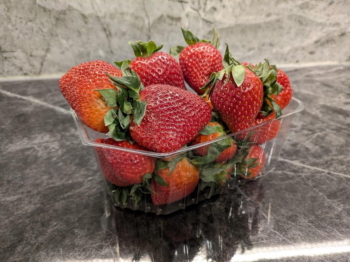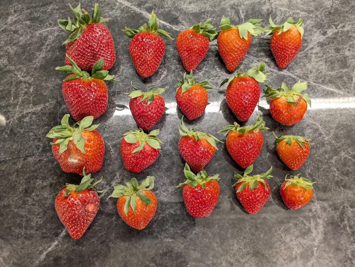 Tak jak przed rokiem kupiliśmy na rynku w Broniszach punetkę truskawek z Grecji i rozłożyliśmy ją na czynniki pierwsze. Niżej widzimy punetkę przed rozpakowaniem. Wynik jest identyczny jak rok temu. Na wierzchu mamy 4–6 truskawek jakości premium. Patrząc z góry na skrzynkę, faktycznie widzimy wysoką i wyrównaną jakość oraz nienaganną prezencję. Im bliżej dna punetki, tym jakość owoców jest niższa.