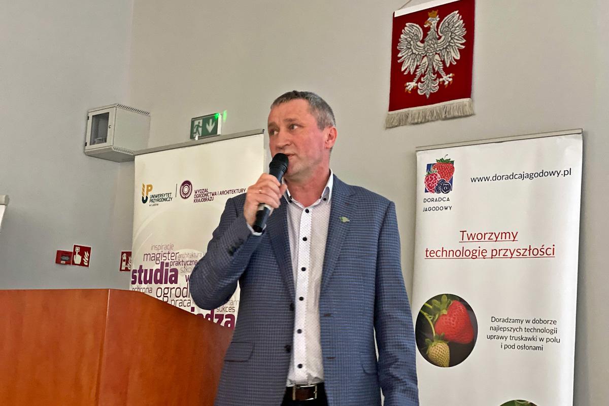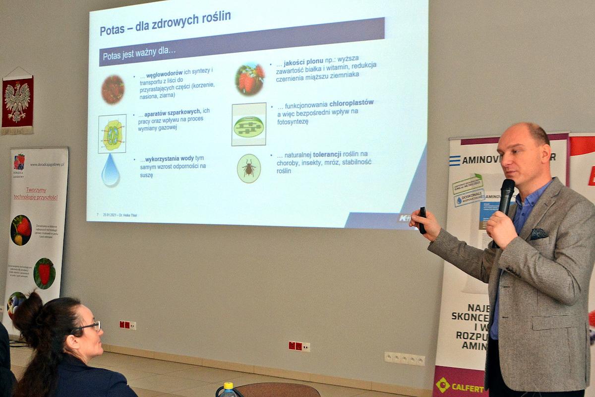 Serię merytorycznych wykładów agrotechnicznych otworzył Jarosław Barszczewski z firmy Calfert, który przedstawił najnowsze zalecenia fertygacji dla wczesnych odmian truskawek uprawianych na przyspieszony zbiór. Prelegent odniósł się zarówno do upraw tunelowych jak i do nasadzeń w otwartym gruncie, okrywanych na płask folią lub włókniną. Podczas wykładu słuchacze mieli okazje poznać zasady bilansowania pożywki do fertygacji przy użyciu prostych kalkulatorów opartych na ogólnie dostępnym programie Excel.