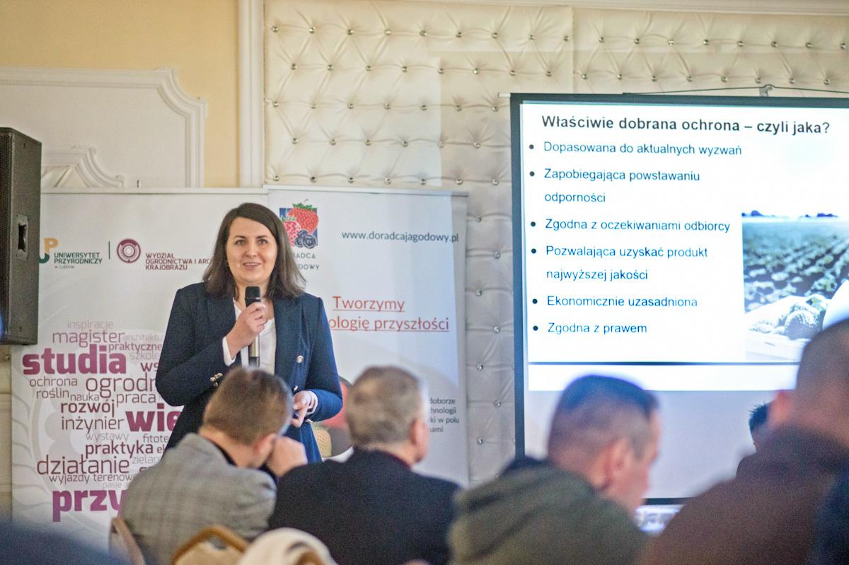 Skuteczne rozwiązania chemiczne w ochronie truskawki przybliżyła uczestnikom spotkania dr Katarzyna Pruska z firmy Syngenta. Prelegentka omówiła niuanse efektywnego stosowania w ochronie znanych i cenionych przez plantatorów truskawki rozwiązań jakim są bez wątpienia Switch 62,5 WG, Scorpion 325 SC, Affirm 095 SG oraz Topas 100 EC.