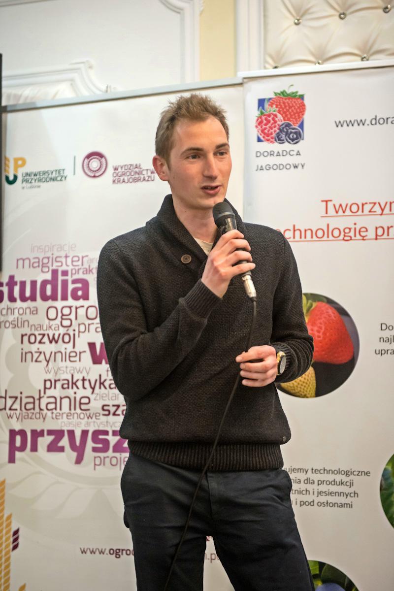 Tematykę eliminacji szkodników glebowych podjął Szymon Jabłoński z firmy Symbioz, prezentując wyniki doświadczeń nad aplikacją preparatu Metacide. Omawiany preparat jest oparty na grzybach entomopatogenicznych z rodzaju Beauveria bossiana oraz Metarhizium, które po zasiedleniu ryzosfery mają zdolność infekowania i unicestwiania szkodników glebowych gatunków jagodowych (pędraków, opuchlaków, drutowców). Prelegent prezentował wyniki licznych doświadczeń wspomagających efektywność biobójczą preparatu, w tym łączenie z preparatami aminokwasowymi.