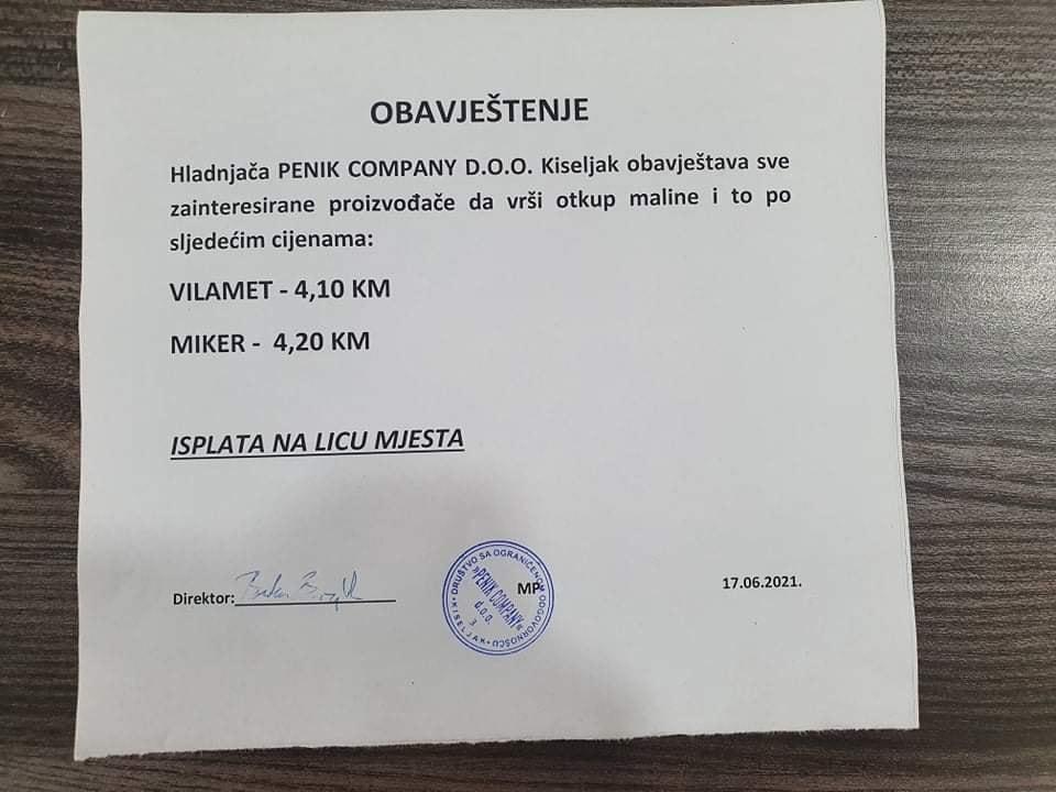 Poniższe zdjęcia przedstawiają cenniki skupu malin z dnia 17 czerwca 2021 roku. Pierwszy przedstawia ceny w Serbii, a drugi w Bośni i Hercegowinie.