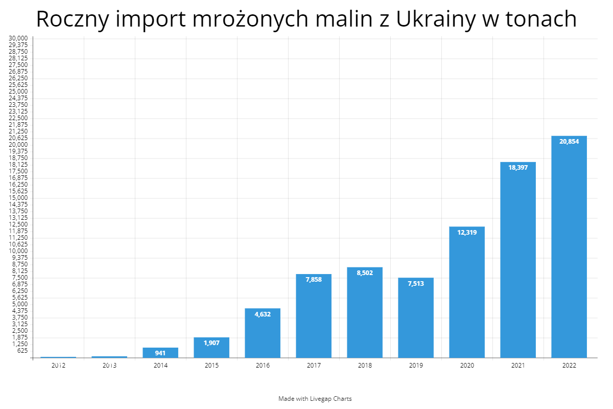 Sytuacja wygląda podobnie, jak w przypadku rynku zbóż. Polski rynek został dosłownie zalany tanimi malinami ze wschodu. Polscy przedsiębiorcy, którzy zajmują się mrożeniem owoców mają z tego powodu problemy. Mrożonki z początku sezonu, kiedy ceny skupu wynosiły od 15 do 20 zł/kg są dziś praktycznie niesprzedawalne lub ich odbiór przez nabywców jest odroczony w czasie. To generuje kolejne koszty dla wspomnianych przedsiębiorstw.