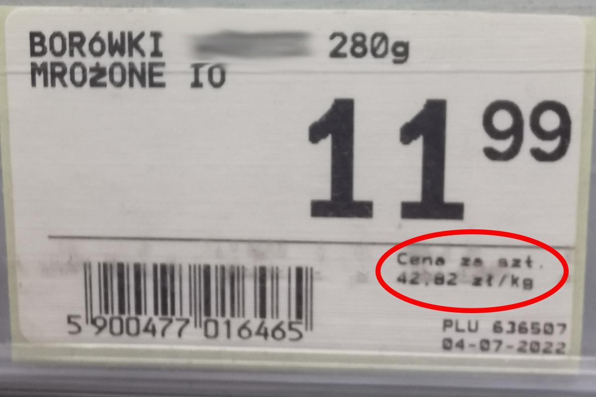 Sprawdźmy jeszcze ceny borówek. Rynek mrożonych borówek w Polsce jest jeszcze bardzo mały. Latem ceny skupu owoców przemysłowych były bardzo stabilne i wahały się od 7,50 do 8,00 zł/kg. Co widzimy na półce marketu? 42,02 zł za kilogram.