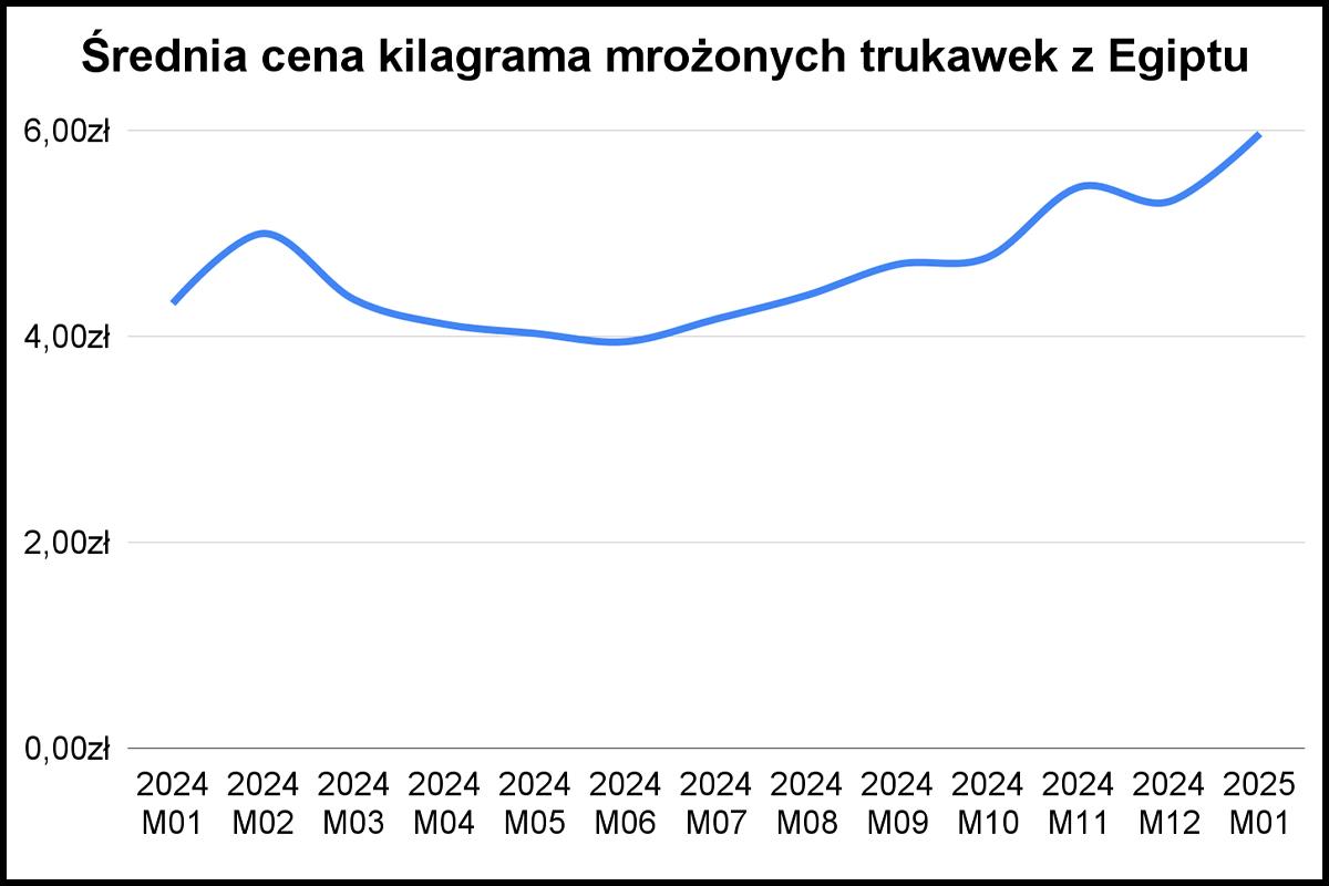Na załączonym wykresie widzimy przegląd średnich miesięcznych cen w ostatnim roku. W maju i w czerwcu 2024 roku odbiorcy w Polsce kupowali mrożone egipskie truskawki poniżej 5,00 zł/kg z transportem. W styczniu 2025 roku produkt kosztował niemal 40% więcej. Warto zaznaczyć, że ceny odznaczają się dużą sezonowością, jednak wszystko wskazuje na to, że nawet jeśli mrożonki będą tańsze w maju to nie będzie to poziom sprzed roku.