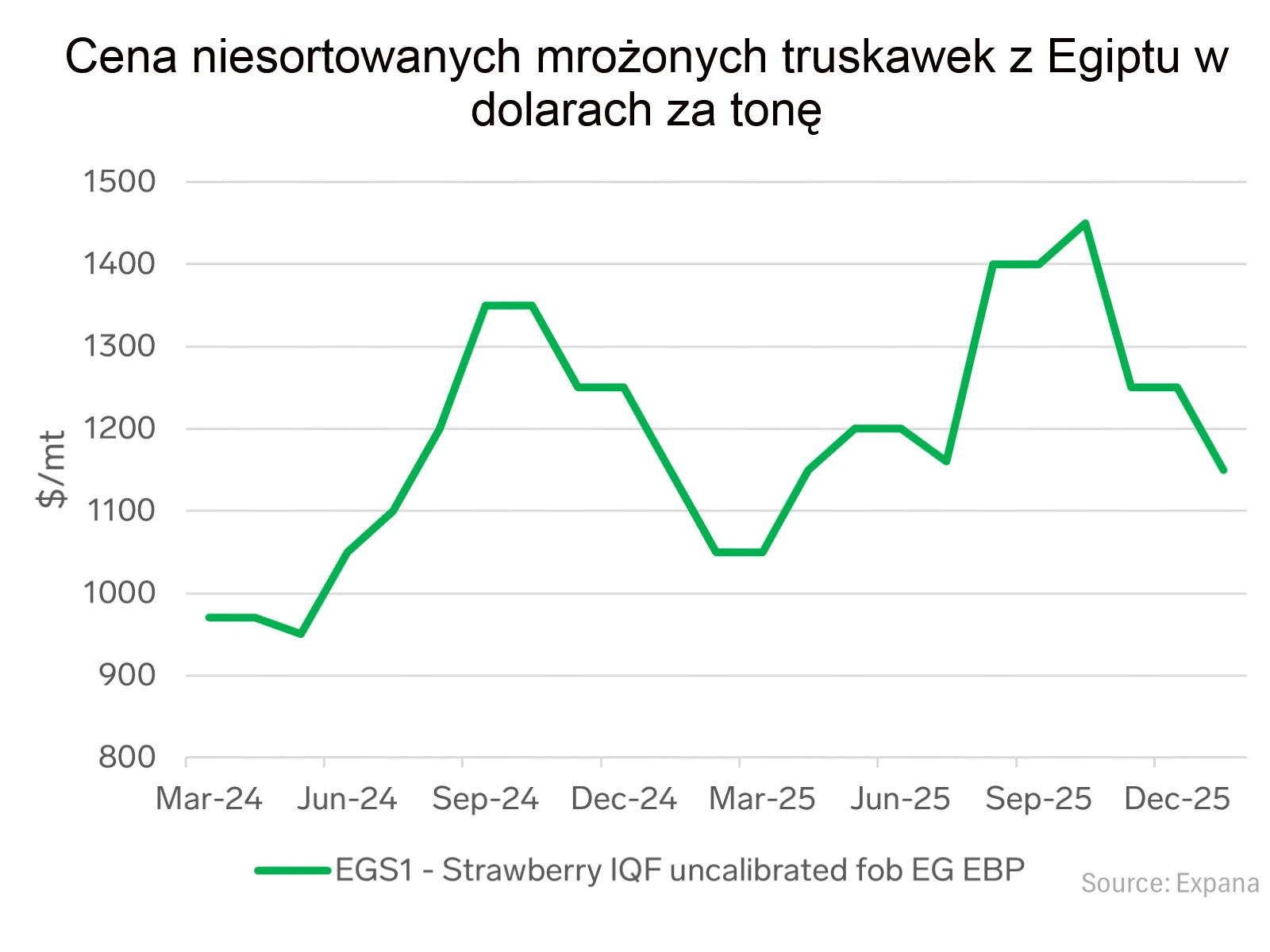 Wraz ze startem nowego sezonu truskawkowego w listopadzie/grudniu 2025 roku wysokie zbiory i duża podaż surowca wpłynęły na stawki. Ceny niesortowanej, mrożonej truskawki w Egipcie (FOB) spadły od początku roku o 8% – do 4000 zł za tonę. Chociaż w dolarach to więcej niż przed rokiem, to cena w złotówkach jest porównywalna z powodu kursu dolara. Mamy zatem przed sezonem dwa czynniki wspierające import. Ale tamtejszym plantatorom też nie brakuje problemów związanych z klimatem i niedoborem wody. Wzrósł areał, wzrosły krajowe plony, ale równocześnie spadła wydajność z każdego hektara.