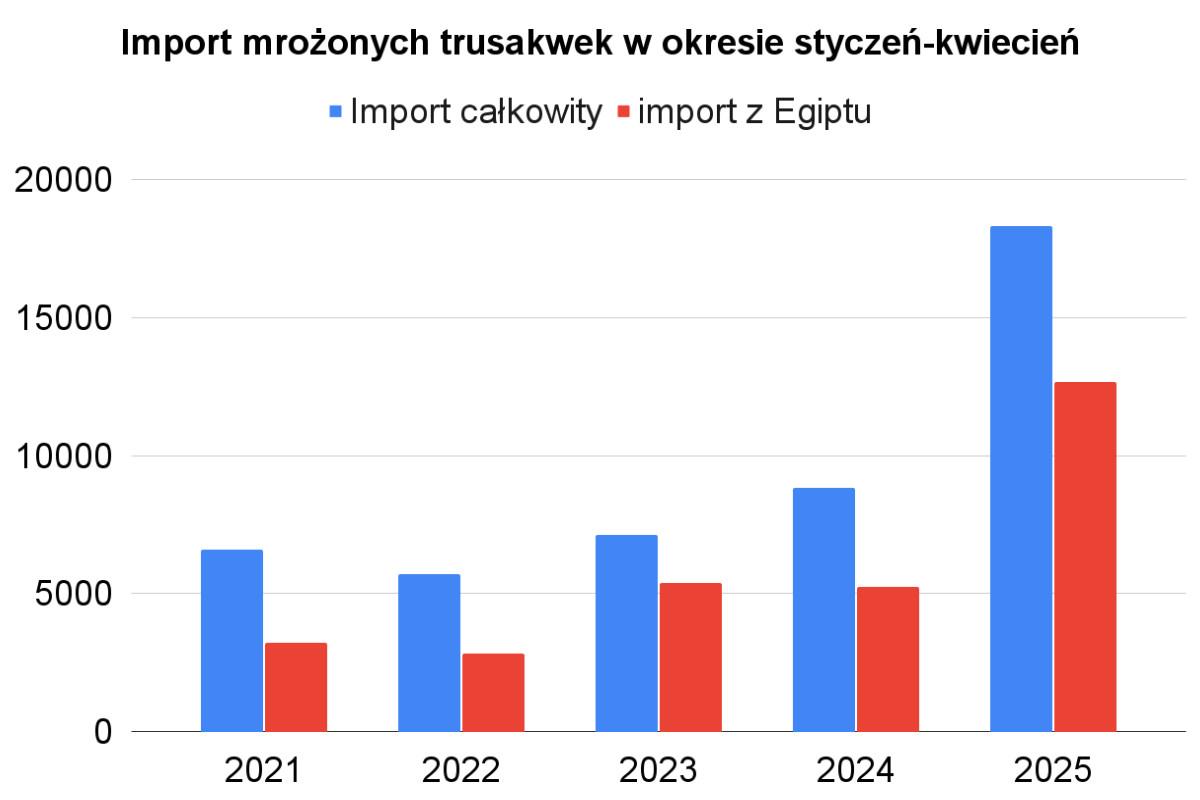 Porównajmy dane z 5 ostatnich lat. W każdym przypadku mówimy o okresie styczeń - kwiecień. W pierwszych czterech miesiącach tego roku sprowadziliśmy z Egiptu do Polski ponad dwa razy więcej mrożonych truskawek niż przed rokiem - ponad 12 tysięcy ton.