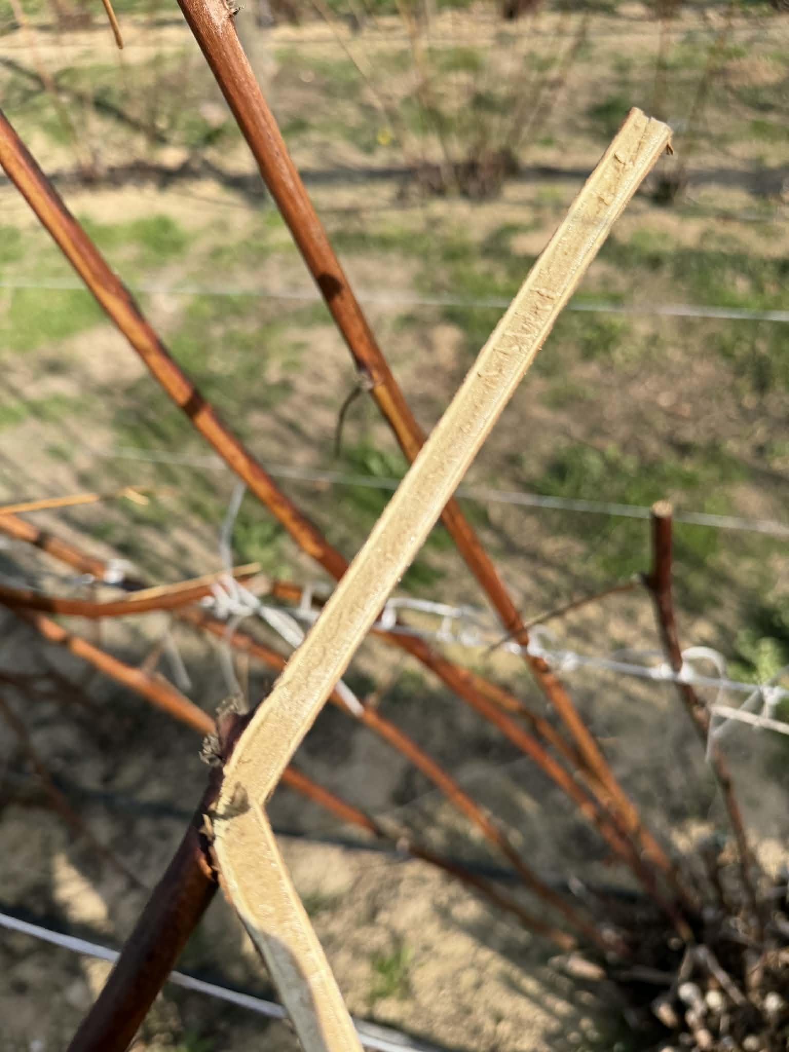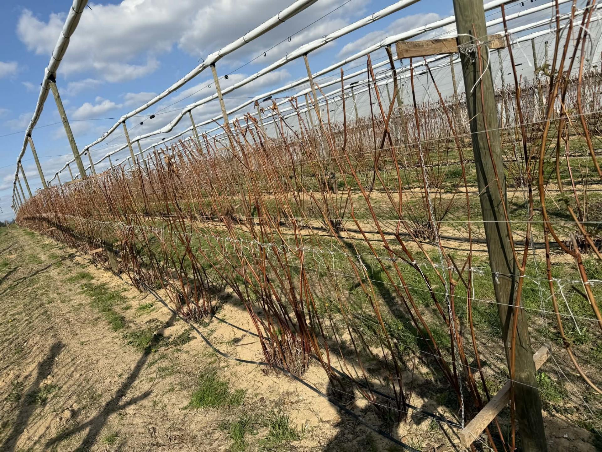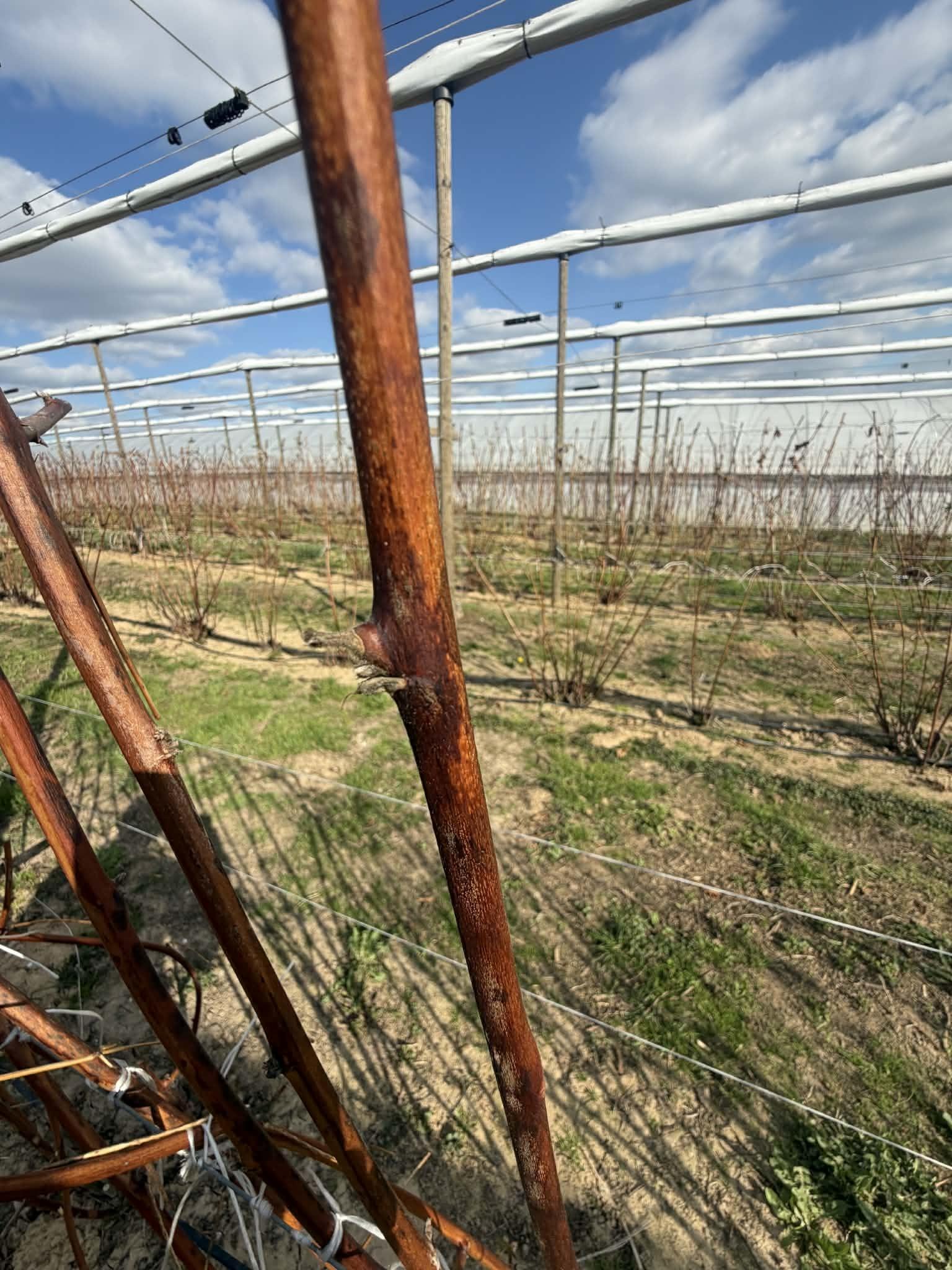 Śnieg na plantacji był, ale ochronił tylko system korzeniowy. Im wyżej, tym uszkodzenia są większe. Najmocniej ucierpiały górne partie roślin, gdzie pędy były podwiązane do drutów.