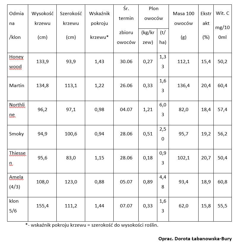 Tabela Siła wzrostu, pokrój krzewu, plonowanie oraz masa i jakość owoców genotypów świdośliwy olcholistnej rosnących w doświadczeniu wdrożeniowym w Sadzie Doświadczalnym w Dąbrowicach, (