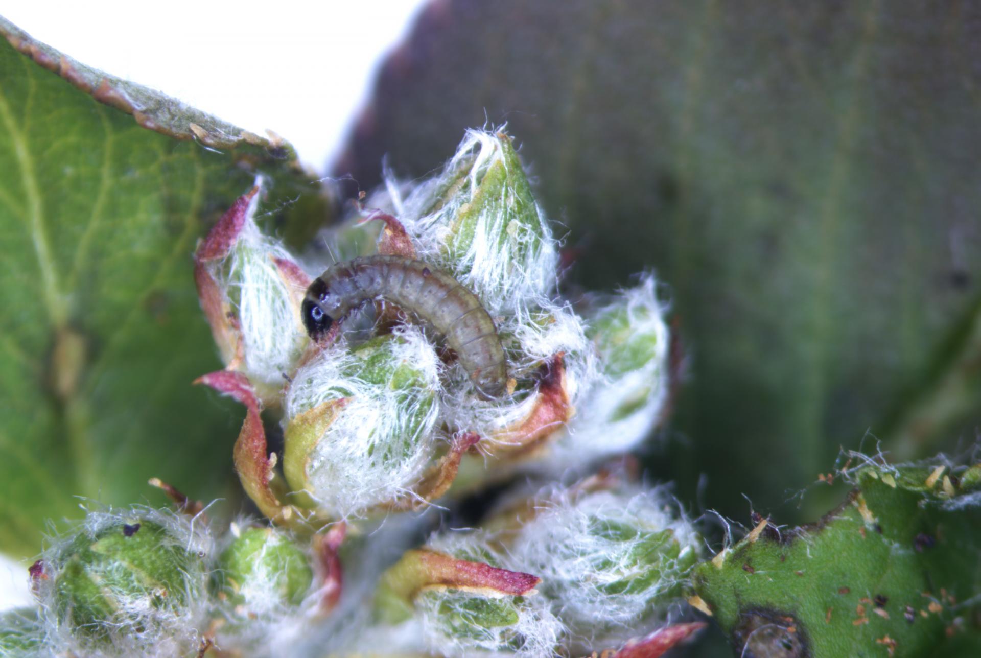 Największe zagrożenie w uprawie aronii czarnoowocowej stanowi gatunek omacnica jarzębianka, który od 2004 roku notowany jest na aronii. Przed zasiedleniem aronii motyl ten powszechnie występował na roślinach z rodzaju głóg i jarząb. Stadium powodującym szkody są gąsienice, która żerują w kwiatostanach wyjadając pąki kwiatowe, tym samym obniżając wielkość plonu. Po ruszeniu wegetacji, kiedy pąki aronii zaczynają się rozwijać, jasnożółte gąsienice ukryte w okresie zimy w kokonach (fot.1) stopniowo opuszczają miejsca zimowania. W tym czasie zmieniają również zabarwienie na zielonobrunatne i zasiedlają rozwijające się pąki kwiatostanowe (fot. 2). W tym okresie są one bardzo ruchliwe i trudne do zauważenia, ze względu na niewielkie rozmiary ciała. Pierwszym sygnałem obecności szkodnika są widoczne pomiędzy pąkami grudkowate odchody gąsienic oraz przędza. Zasiedlanie kwiatostanów przez szkodnika zwykle ma miejsce w pierwszej dekadzie kwietnia (2020 r. Lubelszczyzna), natomiast tegoroczny pojaw jest opóźniony o około 10 dni.