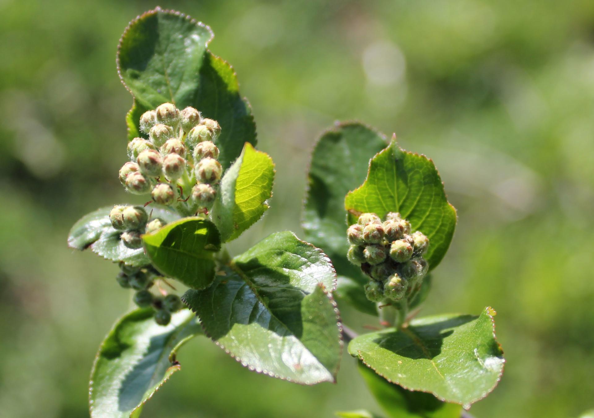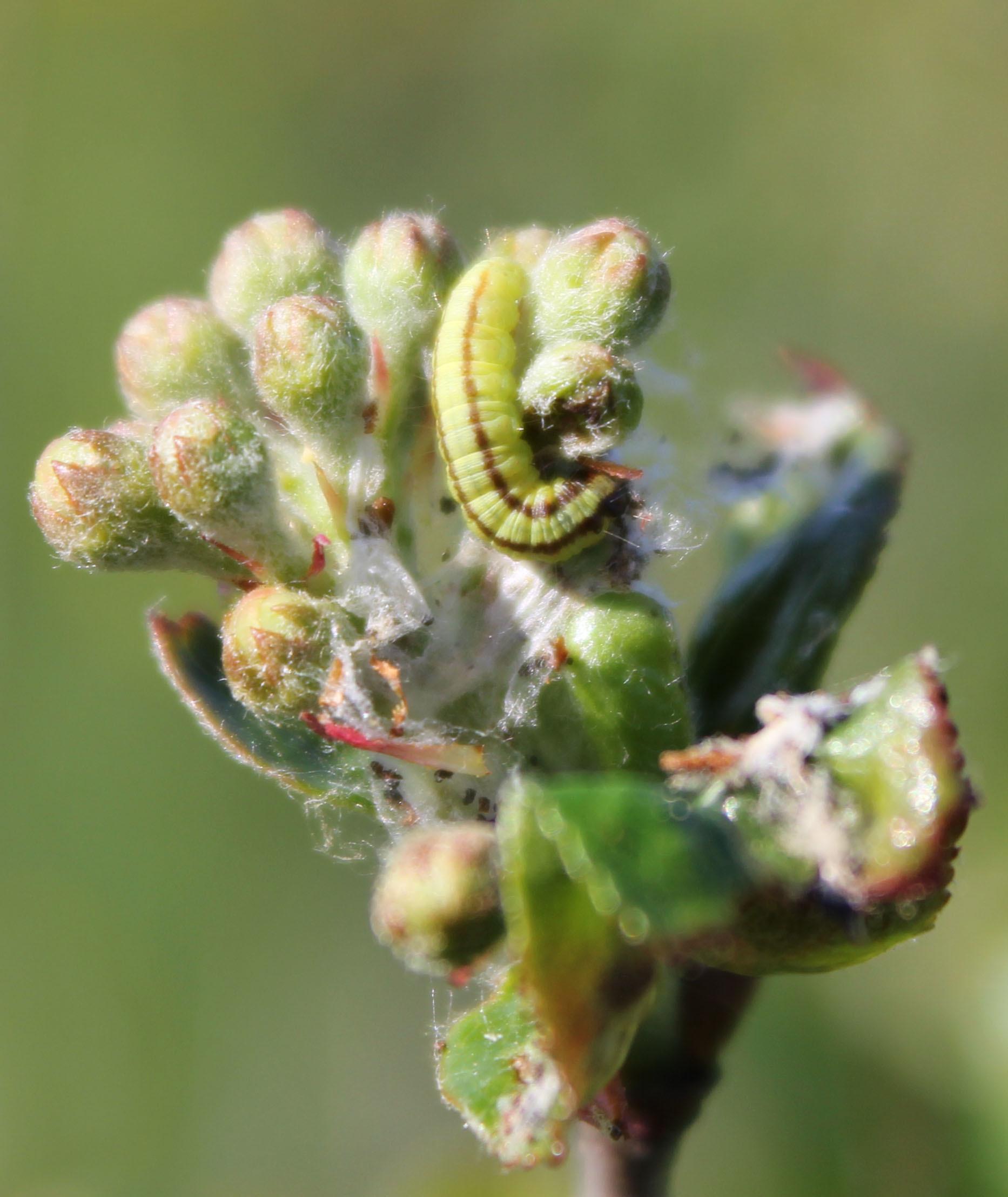 Starsze gąsienice mają jasnozieloną barwę i charakterystyczne dwa pasy na grzbiecie (fot. 3). Zazwyczaj żerują one pojedynczo, ukryte pomiędzy pąkami kwiatowymi i stopniowo je oprzędzają. Pąki przylegają do siebie, a kwiatostan staje się „zbity”. Pomimo braku zewnętrznych objawów żerowania, zasiedlone przez larwy kwiatostany można łatwo odróżnić od nieuszkodzonych, które mają luźno osadzone pąki (fot. 4). Żerowanie gąsienic w kwiatostanach przyczynia się również do obniżenia jakości owoców, poprzez spadek zawartości cennych antocyjanów występujących w owocach aronii.