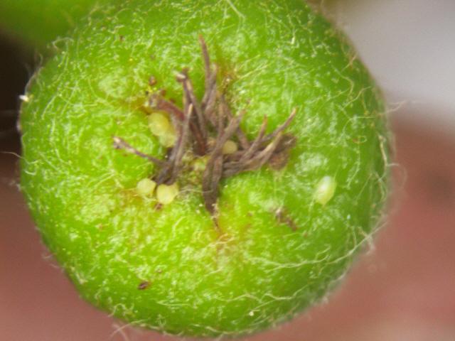 Fot.5. Złoże jaj omacnicy jarzębianki na niedojrzałym owocu aronii czarnoowocwej