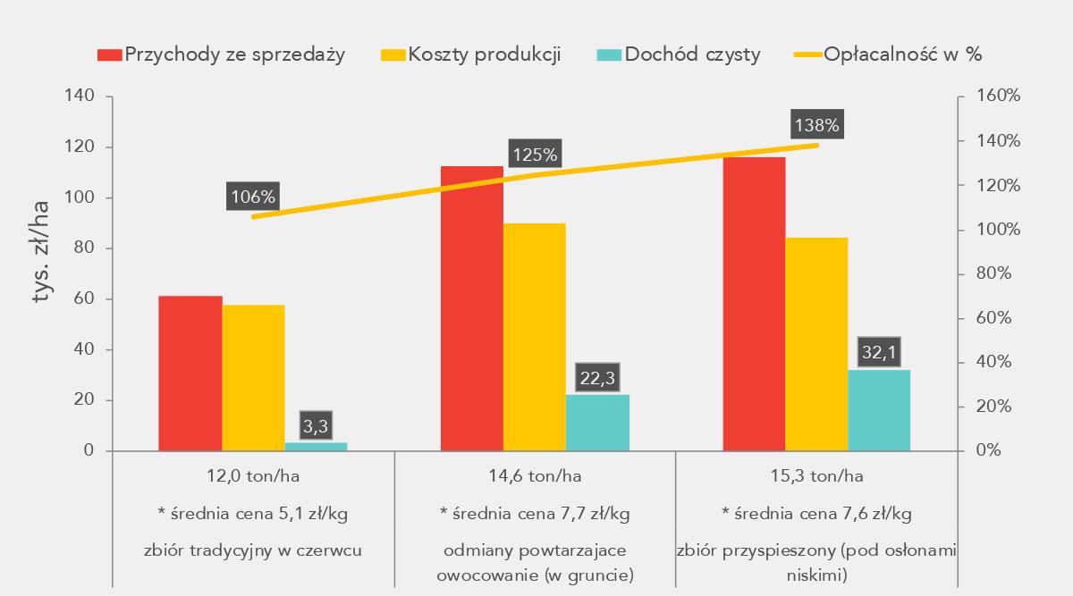 Z wieloletnich obserwacji wynika, że produkcja truskawek deserowych na zbiór w tradycyjnym terminie owocowania (w czerwcu) staje się coraz bardziej mniej dochodowa. Przy średnim plonie, na poziomie 12 ton i cenie 5,1 zł/kg, dochód czysty jest niewiele wyższy niż 3 tys. zł. Natomiast z plantacji na zbiór przyspieszony lub opóźniony można uzyskać o wiele wyższą dochodowość, pod warunkiem utrzymania odpowiedniej jakości owoców i plonu na przyzwoitym poziomie, w granicach, minimum 15 ton z ha, przy czym część owoców to owoce do przetwórstwa (poza wyborem). Stąd, w kalkulacji średnia cena ważona, uwzględnia zarówno cenę truskawki deserowej, jak i przemysłowej (wykres).