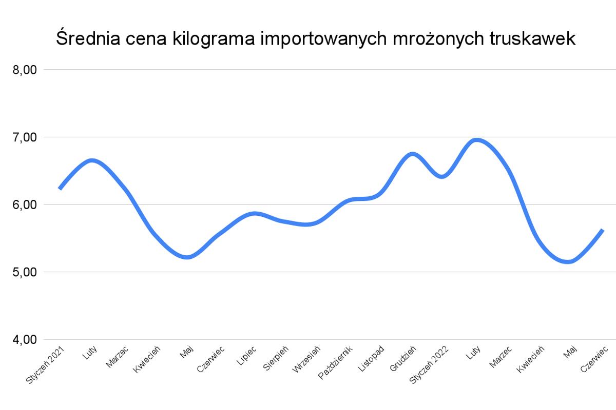 Wczesną wiosną informowaliśmy o wyższych kosztach transportu, które sprawiały, że średnia cena kilograma rosła. Tak było do lutego, wówczas kilogram kosztował średnio niemal 7,00 zł. Niemniej eksporterzy (głównie z Egiptu) obniżali ceny, czyli mając na uwadze ówczesne, wysokie koszty transportu „schodzili z marży”, aby nadal być konkurencyjnymi. Oba wykresy doskonale się na siebie nakładają. Najniższa średnia cena kilograma mrożonych truskawek równocześnie odpowiada najwyższemu importowi.