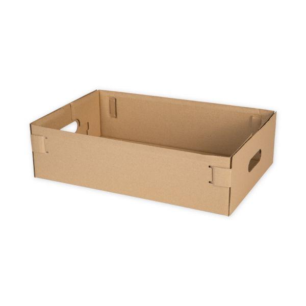 Mamy również skrzynki na owoce o nieco większym rozmiarze, jak jabłka czy gruszki. Wyposażono je w specjalne otwory, dzięki którym ich przenoszenie nie sprawia żadnych kłopotów, a do wnętrza skrzynki dostaje się powietrze, dzięki czemu owoce dłużej zachowują trwałość. Bardzo ważna cecha takich skrzynek to również łatwość transportu. Bez problemu można je ułożyć jedna na drugą, dzięki czemu nie zajmują wiele miejsca. Oczywiście takie skrzynki spisują się również jako kartony do warzyw różnego rodzaju. Powstają z wytrzymałej, grubej tektury, dlatego znoszą obciążenia do 10 kg. Przygotowaliśmy m.in. skrzynki na owoce i warzywa o wymiarach 400x300x150 mm.