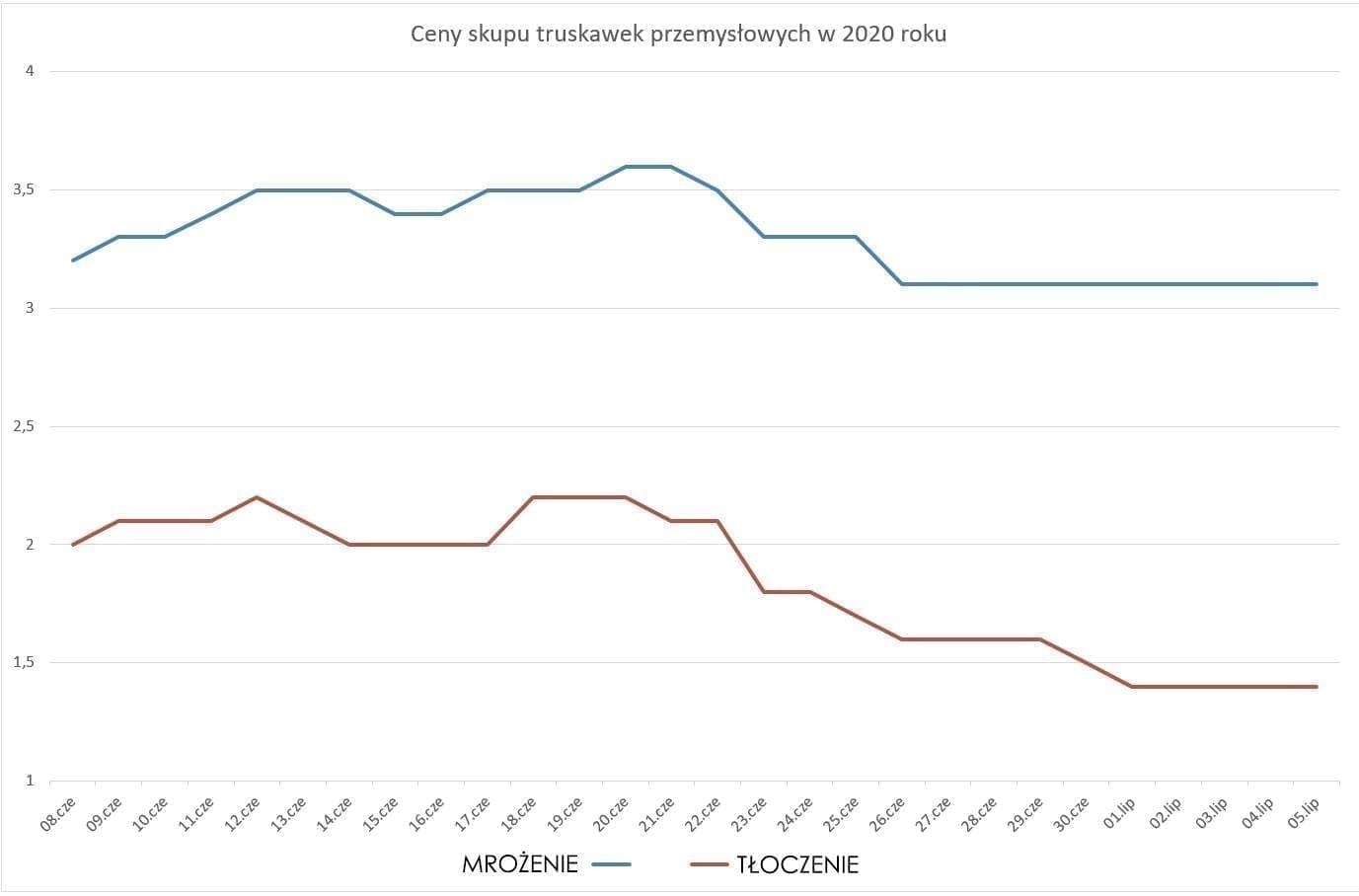 Średnia cena skupu truskawek wyniosła w tym roku 3,30 zł za kilogram owoców na mrożenie, oraz 1,80 zł za kilogram truskawek na tłoczenie. Warto również wspomnieć o tym, że tegoroczny sezon zbiorów i skupu jest nieco krótszy niż ubiegłoroczny. W ubiegłym roku skupowano truskawki praktycznie przez cały czerwiec, czyli około 30 dni. W tym roku rozpoczęto skup około 10 czerwca, a od początku lipca firmy kupują niezwykle małe ilości surowca.