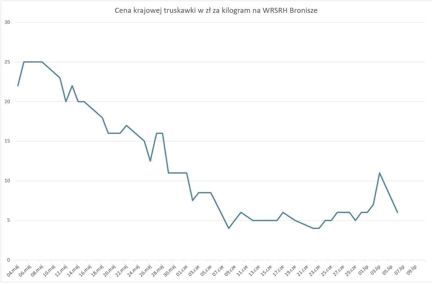 Niżej ceny z podwarszawskiego rynku w Broniszach. Były niestety dni, gdy truskawki nieco drobniejsze, czy te słabszej jakości sprzedawano nawet po 6 zł za łubiankę, czyli nieco poniżej ceny skupu truskawek na mrożenie. W takich momentach wielu plantatorów krytycznie wypowiadało się o tych, którzy sprzedawali swoje truskawki w takich cenach.