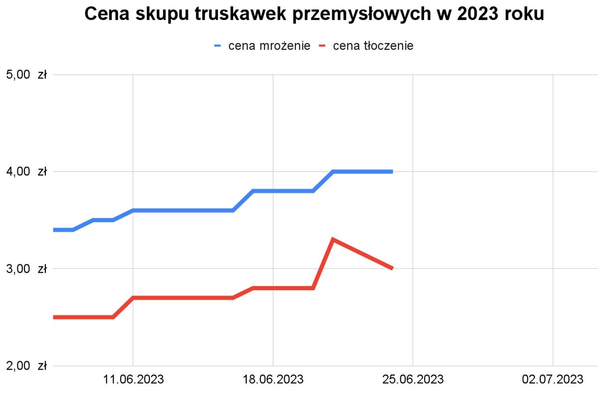 Oczywiście, zbiór truskawek z szypułką jest znacznie szybszy niż zbiór owoców bez szypułki z przeznaczeniem na mrożenie. W związku z tym w ciągu ostatnich dni podaż owoców do tłoczenia wyraźnie wzrosła. Ma to błyskawiczne przełożenie na cenę skupu, która od wtorku spadła o 30 gr na kilogramie, co widzimy na wykresie poniżej.