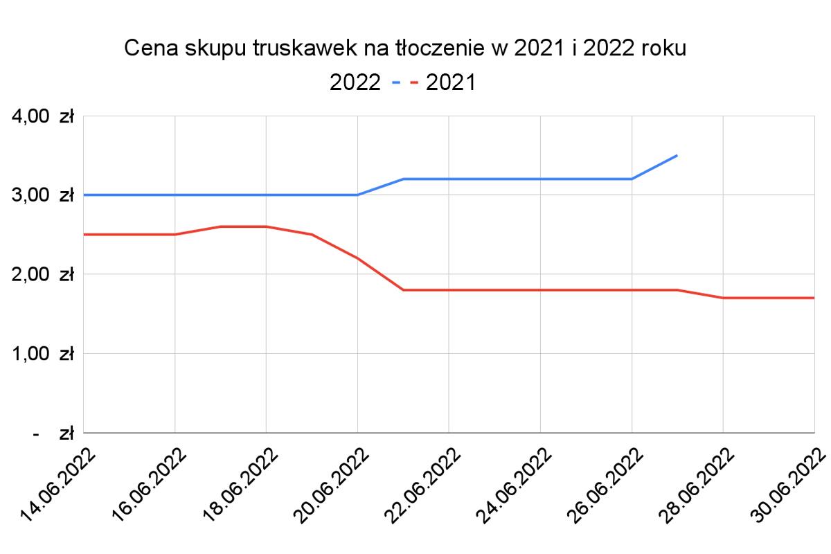 Zwróćmy uwagę na inną niezwykle ciekawą kwestię. Otóż w analogicznym okresie ubiegłego roku truskawki deserowe kosztowały na rynkach hurtowych tyle samo, co dziś w skupie kosztują owoce na tłoczenie. Mówimy tu o cenie 7,00 zł za łubiankę (3,50 zł za kilogram).