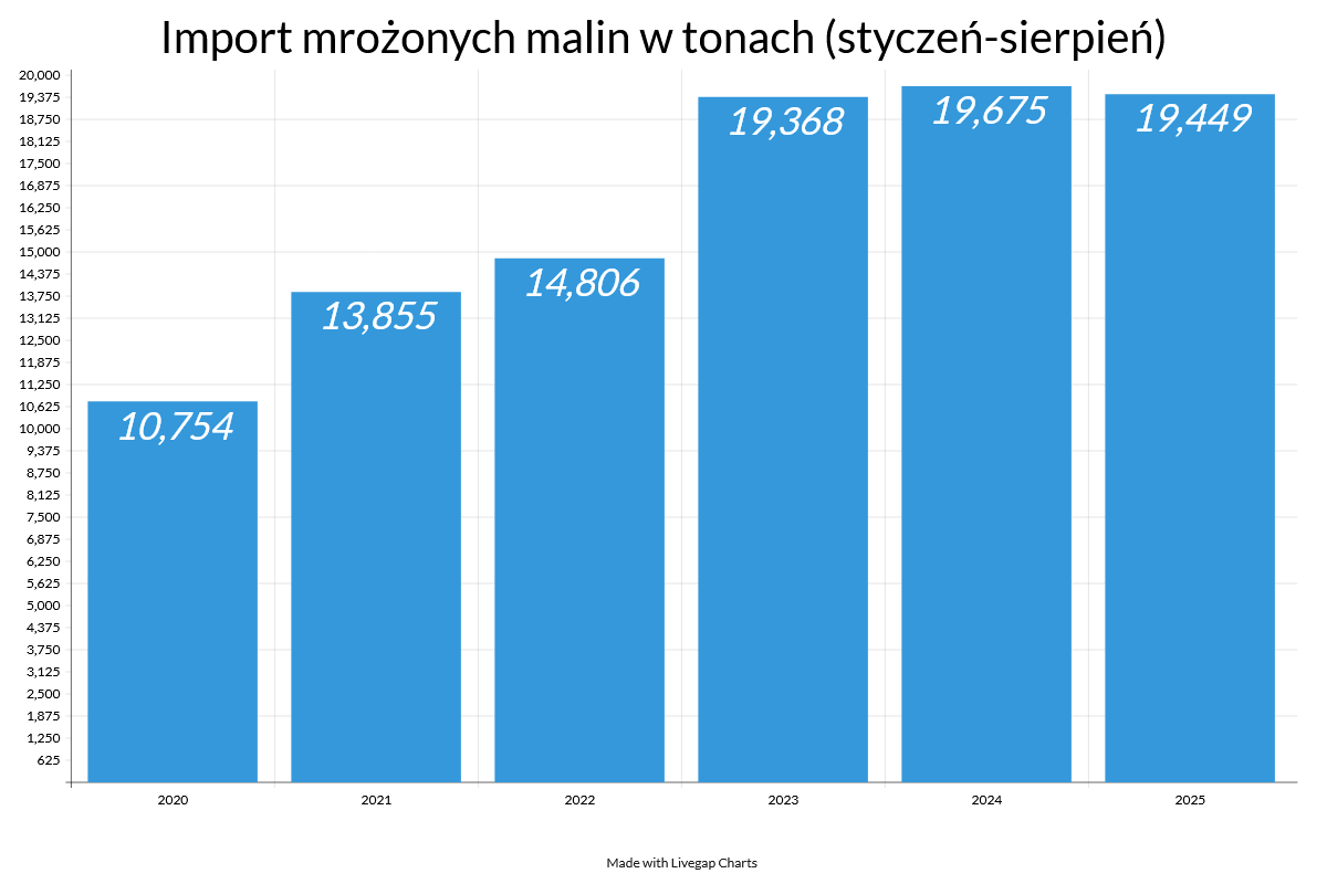 Od momentu otwarcia unijnej granicy na produkty ukraińskie import mrożonych malin do Polski znacznie wzrósł po 2022 roku. Udział mrożonek z Ukrainy był i nadal jest dominujący w strukturze dostaw, choć powoli maleje. W tym roku wynosi 55%. Najbardziej rośnie znaczenie Maroka i Serbii jako istotnych źródeł dostaw.