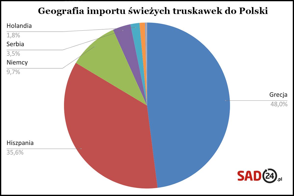 Import świeżych truskawek do Polski jest największy wiosną. Najwięcej dostaw przypada na marzec, kwiecień i maj, głównie z południa Europy, czyli z Grecji i z Hiszpanii. Wśród krajów eksportujących do Polski są też Serbia, Albania, Niemcy czy Holandia.