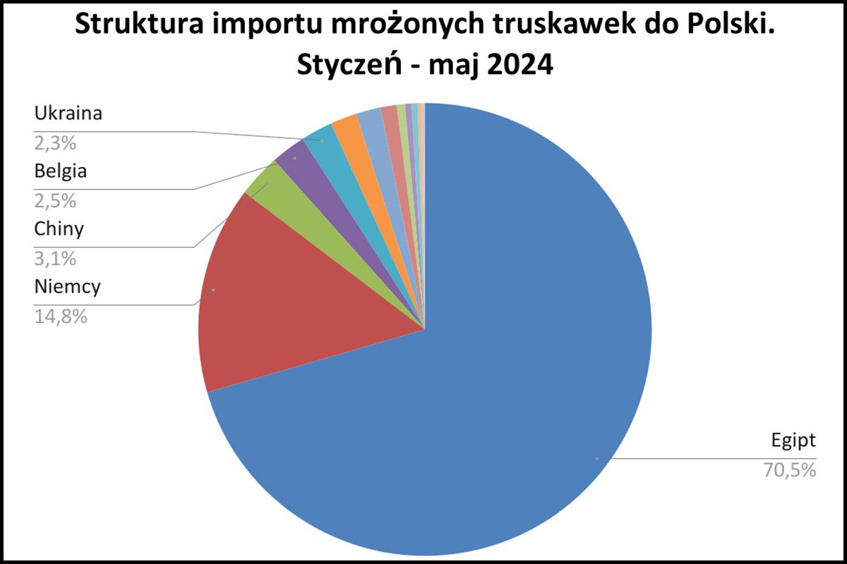 Niżej załączamy strukturę importu mrożonych truskawek do Polski w pierwszych pięciu miesiącach tego roku. Doskonale widzimy znaczącą dominację dostaw z Egiptu.