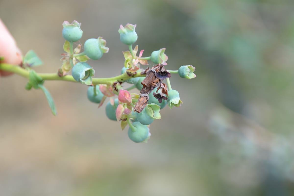 Na plantacjach borówki zakończyło się kwitnienie i rozpoczął się kolejny etap intensywnego wzrostu owoców. Na niektórych plantacjach można zaobserwować nadmierne zawiązanie owoców oraz brak liści. W takich przypadkach najdrobniejsze zawiązki zatrzymały się we wzroście. Jest to konsekwencja uszkodzeń mrozowych. Najprostszym rozwiązaniem przywracającym równowagę pomiędzy fazą generatywną oraz wegetatywną jest w tym momencie wycięcie nadmiaru zawiązków i zastosowanie intensywnego nawożenia.