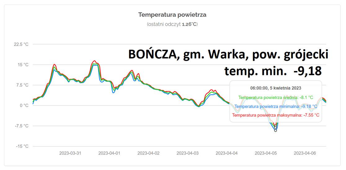 Poniżej przedstawiamy wykaz kilkunastu najniższych temperatur występujących w ostatnich kilku dniach na terenie kraju. Odczyty temperatur najczęściej wykonywane są na wysokości około 2 metrów nad powierzchnią gruntu.