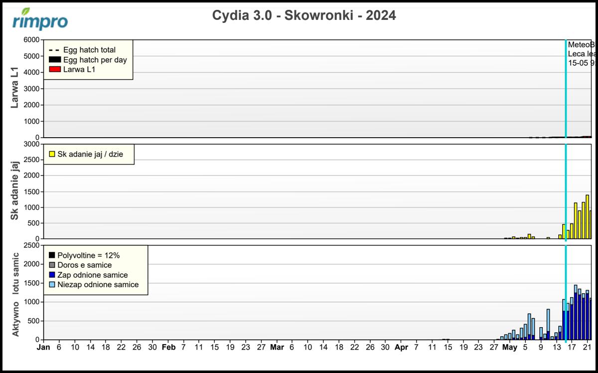 W ubiegłym tygodniu obserwowaliśmy już aktywność owocówki jabłkóweczki. Teraz przy ochłodzeniu ta aktywność jest minimalna. Pamiętajmy jednak, że szkodnik intensywnie składa jaja, gdy podczas zachodu słońca temperatura jest powyżej 16,5 stopnia Celsjusza. Dlatego na razie presja ze strony owocówki jest ograniczona. Ale musimy pamiętać o przygotowaniu się do właściwej ochrony przeciwko szkodnikowi. W przypadków sadów z dużą presją powinniśmy zaplanować i wykonać zabieg na początku przyszłego tygodnia, ale termin ten może jeszcze ulec zmianie.