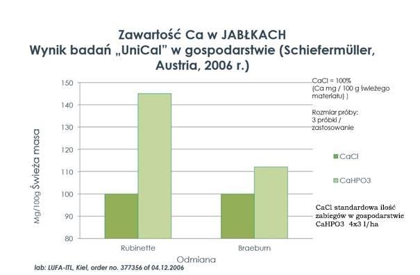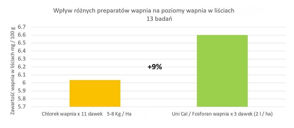 Poniżej wyniki doświadczenia, w którym porównano efekty działania nawozu UNI-CAL® w zestawieniu z chlorkiem wapnia. Tabela pokazuje zawartość wapnia w liściach po 11 zabiegach chlorkiem wapnia w porównaniu do 3 zabiegów nawozem UNI-CAL®.
