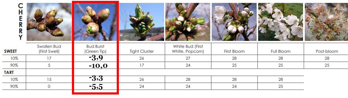 W tabeli niżej widzimy temperatury, które powodują 10% i 90% uszkodzeń w danej fazie fenologicznej. Opracowali naukowcy z Uniwersytetu Stanowego w Utah (LINK). Niestety, jeśli przyjmiemy, że prognozy się sprawdzą to lokalnie istnieje ryzyko utraty znaczącego odsetka pąków kwiatowych w przypadku wiśni w aktualnej fazie rozwojowej drzew gatunku.