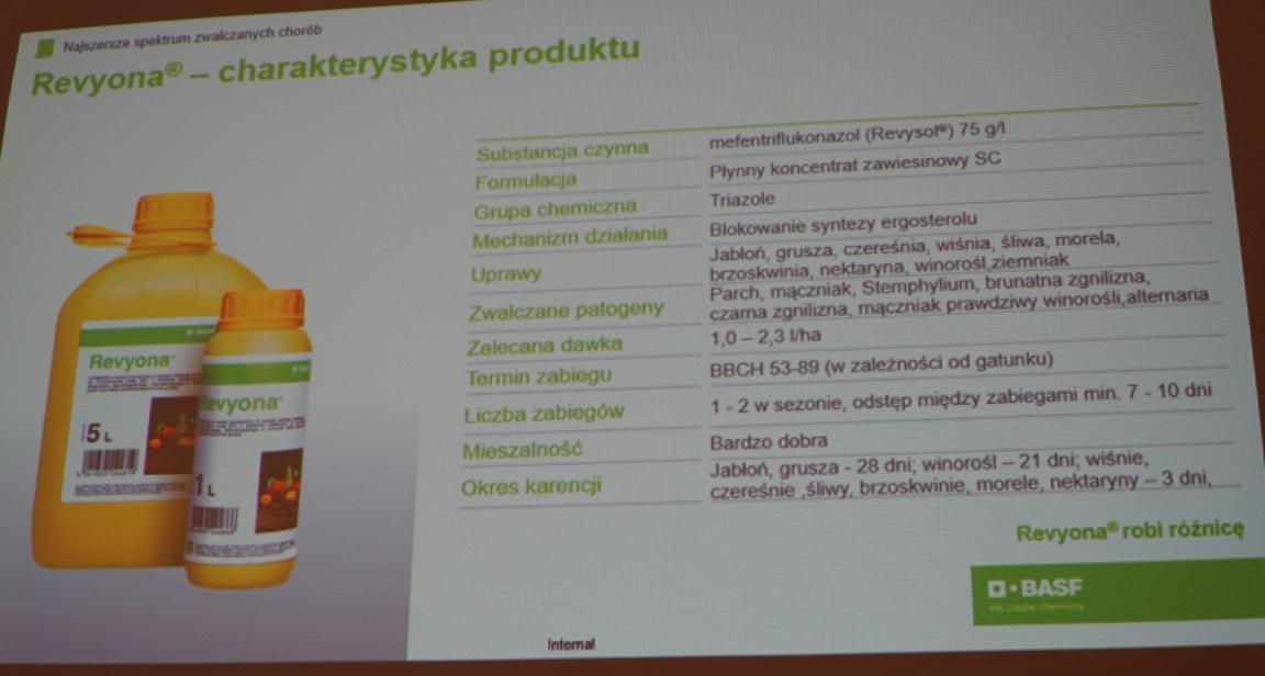 Jednak głównym punktem wydarzenia było przedstawienie nowego fungicydu należącego do grupy triazoli - Revyona®. Jak wyjaśnił Przemysław Kostrzewski, niestety, biorąc pod uwagę zmiany zachodzące na szczeblach unijnych, pewne standardowe rozwiązania będą znikać. Zachodzi pytanie czym je zastąpić. Jednym z rozwiązań jest Revyona®, która od tego roku będzie dostępna na rynku. Nowy fungicyd działa na wiele chorób m.in. parcha gruszy, parcha jabłoni, stemphylium, mączniaka jabłoni i gruszy, a w uprawach pestkowych między innymi na brunatną zgniliznę drzew pestkowych. O aspektach jego stosowania mówili dr Jacek Lewko, a także Artur Srokosz z BASF.