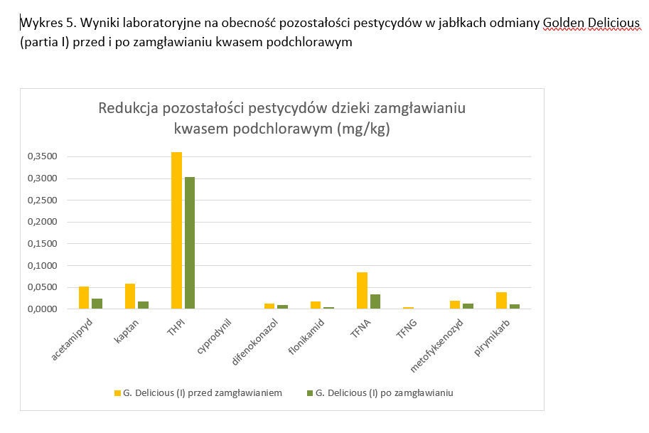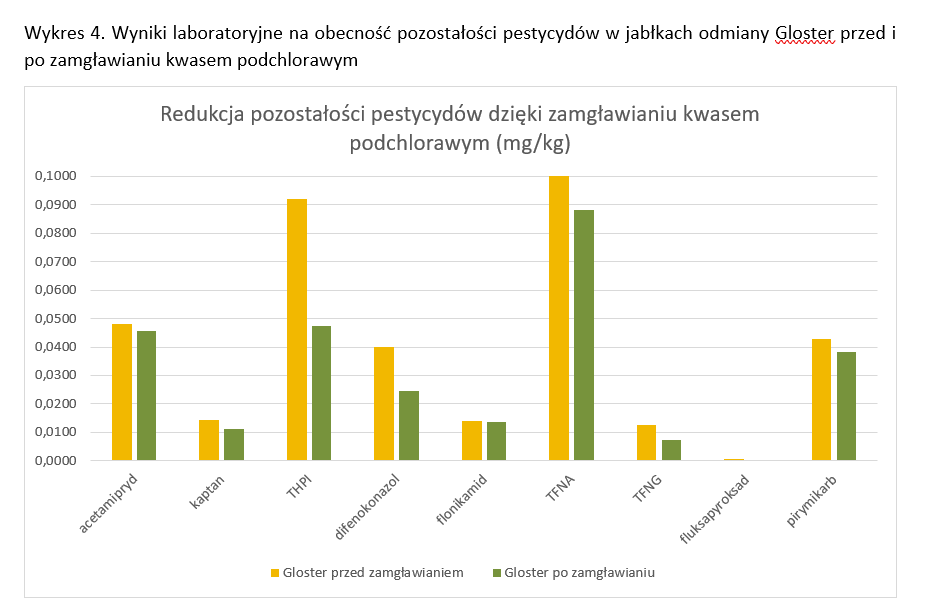 Największa redukcja została zaobserwowana w przypadku niskiej zawartości pestycydów. Bardzo ciekawe jest to, że zamgławianie kwasem podchlorawym spowodowało redukcję pestycydów nie tylko tych o działaniu kontaktowym ale i tych o działaniu systemicznym. Kwas podchlorawy ma bowiem działanie tylko kontaktowe. Świadczyć to może o tym, że pozostałości środków o działaniu systemicznym pozostają również przez pewien czas na powierzchni skórki.