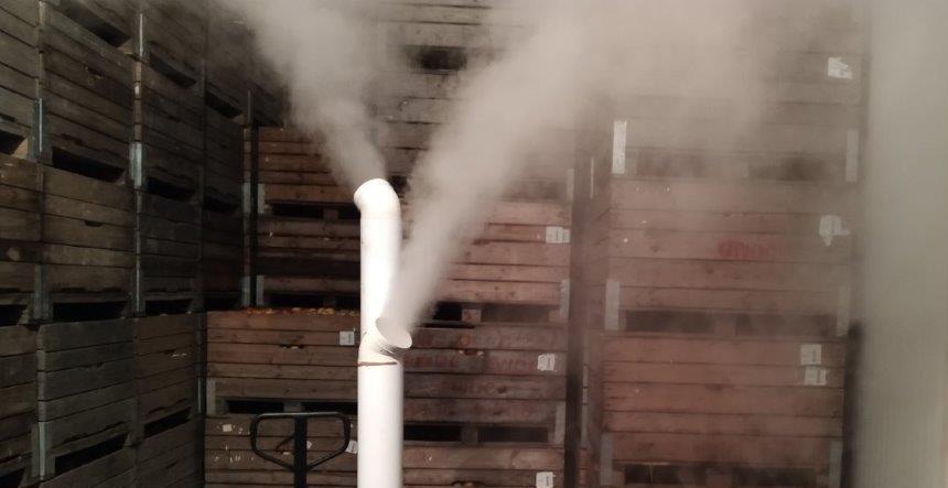 Bardzo dobre wyniki badań laboratoryjnych według normy EN 17272 potwierdziły możliwość wykorzystania zamgławiania kwasem podchlorawym chłodni i owoców podczas ich przechowywania. Mowa tutaj o zamgławianiu tak zwaną suchą mgłą kwasem podchlorawym (fot. 4).