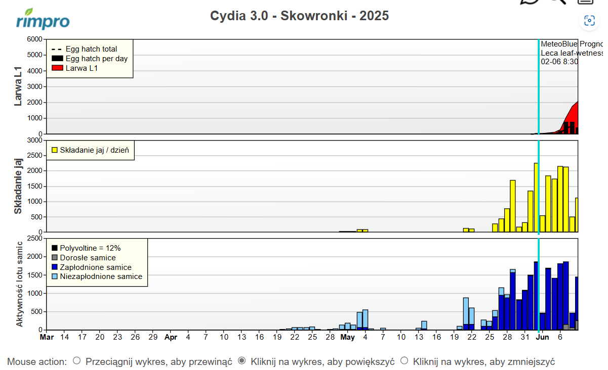 Niemniej według modeli pod koniec tygodnia warto jest wykonać zabieg zwalczający pierwsze larwy owocówki. Oczywiście tak czy inaczej decyzję o zabiegu należy podejmować w oparciu o indywidualnie prowadzony monitoring. Chociaż i przy dokładnej obserwacji lotów nie brakuje w tym sezonie dylematów. Wielu z nas zastanawia się czy wyjątkowo zróżnicowana intensywność lotów nie doprowadzi do tego, że i wylęg larw będzie rozciągnięty w czasie...
