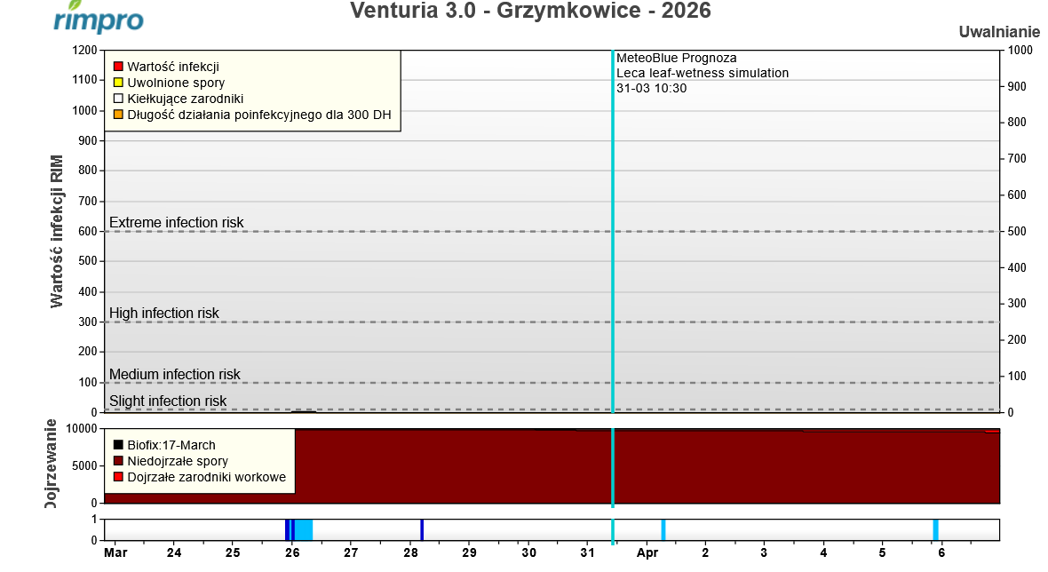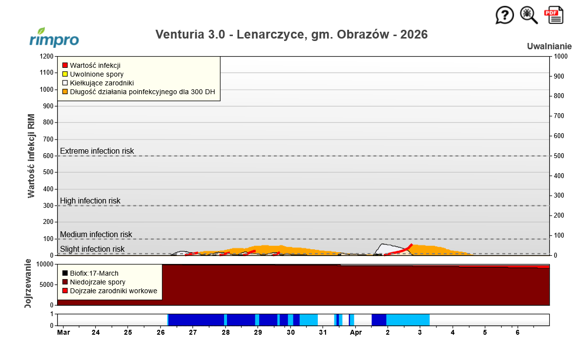 W rejonie Sandomierza spadło więcej deszczu niż w rejonie Grójca – do 10 litrów na metr kwadratowy. Wegetacja także jest tam nieco bardziej rozwinięta niż w centrum kraju. Modele chorobowe wyliczają ryzyko minimalnej infekcji na noc z 2 na 3 kwietnia.
