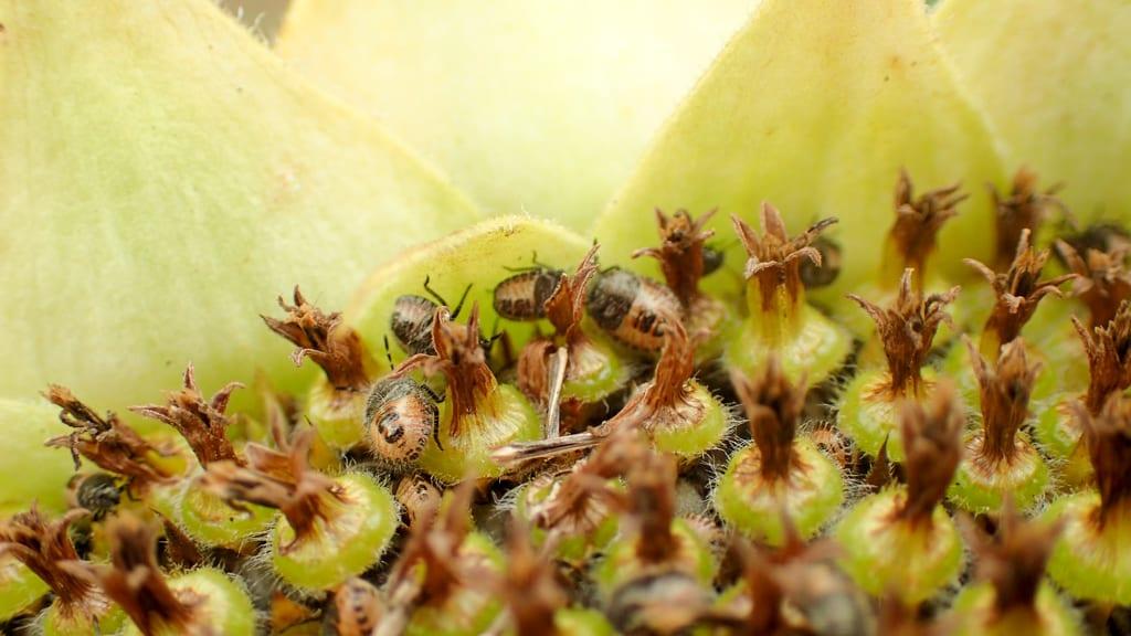 Pluskwiaki mogą uszkadzać owoce np. malin, jeżyn, truskawek, poziomek, winorośli (fot. 3), porzeczki, agrestu. Na słoneczniku nakłuwają kwiaty i formujące się nasiona (fot. 4–6). Owady, wysysając soki z owoców, mogą psuć ich smak. Wydzielają one bowiem substancje chemiczne o działaniu odstraszającym.