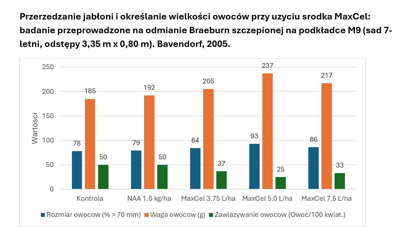 Stosowanie cytokinin na wczesnych etapach rozwoju owoców, od okresu po kwitnieniu do momentu, gdy owoc osiągnie 18 mm, działa jako środek przerzedzający, stymuluje opadanie zawiązków bocznych. MaxCel jest regulatorem wzrostu roślin posiadającym w swoim składzie 6-benzyloadenine (6-BA) z wbudowanym surfaktantem, który stymuluje wzrost pędów i zakładanie pąków, a także intensywny podział komórek.