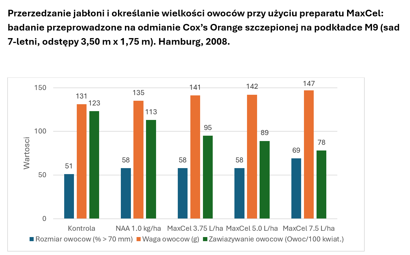 Poniżej przedstawiono dwa przykłady skuteczności stosowania preparatu MaxCel w przerzedzaniu owoców jabłoni oraz zwiększaniu ich wielkości i masy.