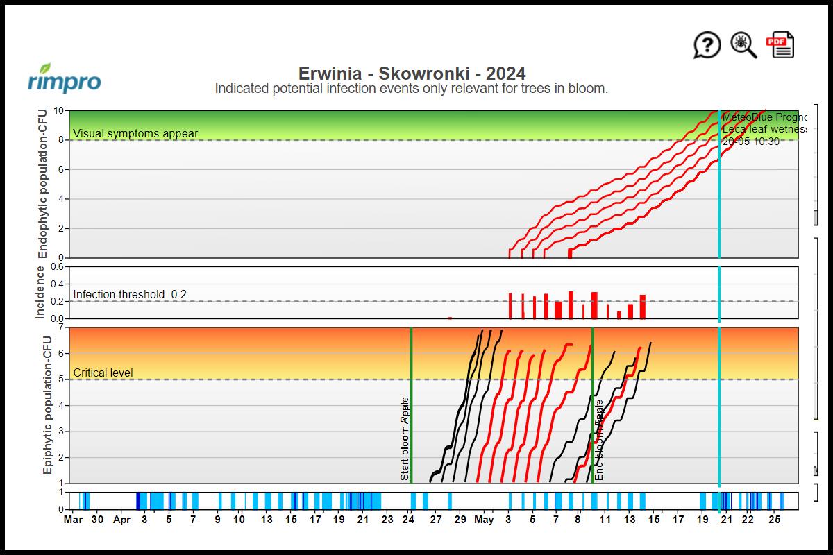 Problem „widzą” także algorytmy. Jak widzimy niżej, model dla zarazy ogniowej przewiduje pojawienie się widocznych objawów choroby w najbliższych dniach po infekcjach z pierwszej połowy maja.
