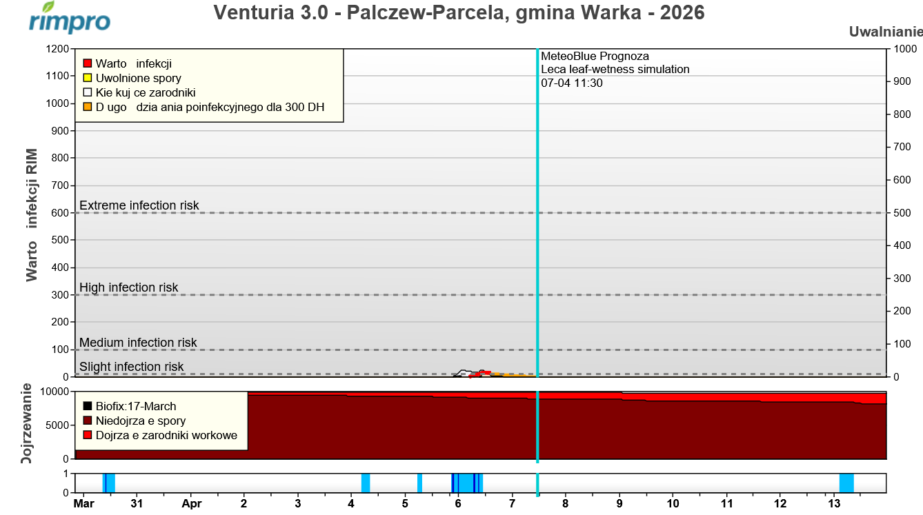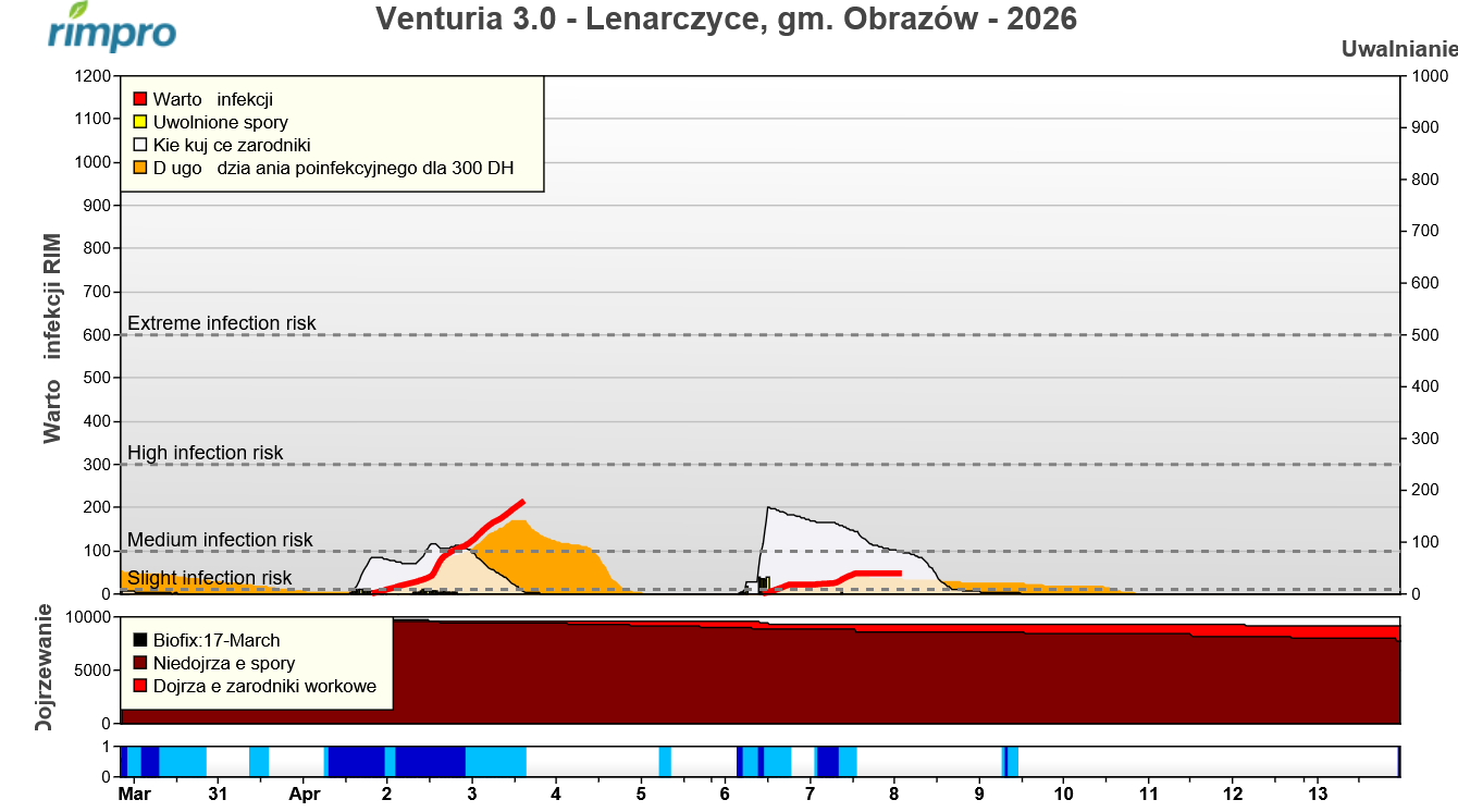 W efekcie zarówno tuż przed świętami, czyli 3 kwietnia, jak i jutro oraz pojutrze, czyli 7 i 8 kwietnia, model RIMpro wyliczył infekcje dla stacji w Lenarczycach, w gminie Obrazów. Na załączonym niżej wykresie widzimy, że pierwsza infekcja była średnia, a nadchodząca będzie minimalna.