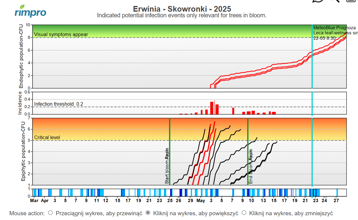 Szczególną uwagę warto zwrócić na presję zarazy ogniowej w sadach posadzonych wiosną tego roku. Obecnie wiele z nich jest w fazie kwitnienia, a to właśnie kwiaty stanowią wrota do infekcji. Potwierdzają to modele chorobowe: