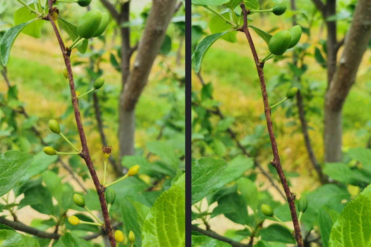 Podobnie jak jabłonie, osłabione śliwy zrzucają znaczny odsetek zawiązków. Tak jak widzimy na poniższych przykładach, wszystkie mniejsze zawiązki spadną. Mniej więcej z 5 zostaje jeden, który będzie pełnowartościowym owocem. Producenci informują, że w tym roku plonowanie śliw będzie słabe z wyjątkiem Lepoticy. W przypadku tej odmiany, która z natury charakteryzuje się dużą plennością, sytuacja z zawiązaniem wygląda zdecydowanie najlepiej.