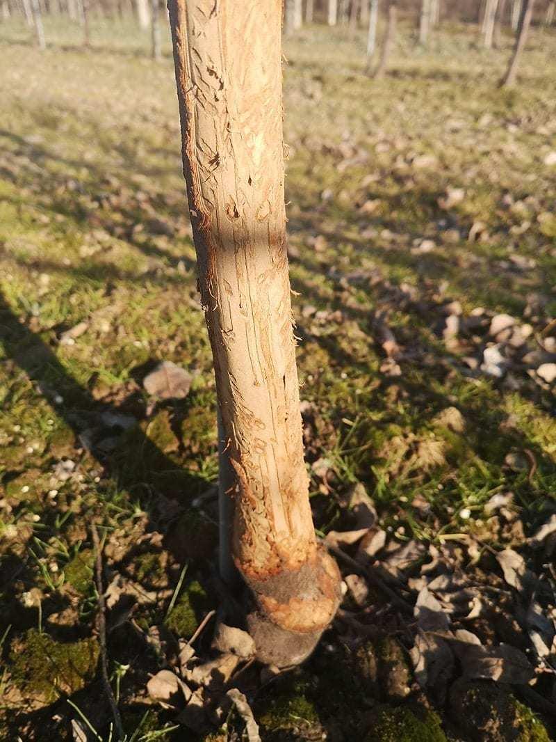 Na widocznych zdjęciach, 4 letni Erovan na M9. Kilka drzew ma przegryzioną na około korę. Wiele co prawda będzie żyć, ale kora jest zgryziona na połowie do trzech czwartych średnicy pnia. Wymaga to zabiegu malowania tak zwaną sztuczną korą.