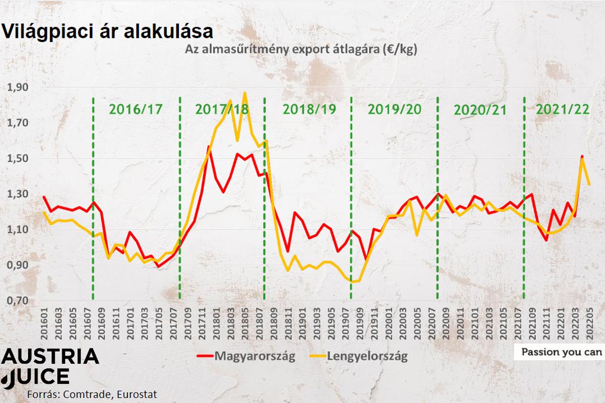 Warto zatrzymać się na chwilę na poniższym wykresie, prezentuje on ceny polskiego (żółta linia) oraz węgierskiego koncentratu (czerwona linia) na przestrzeni ostatnich sezonów. W latach o przeciętnym urodzaju ceny są porównywalne. Jednak w pamiętnym sezonie 2018/19 kilogram polskiego koncentratu był mniej więcej o 0,90 zł tańszy. Z kolei w roku przymrozkowym ceny w Polsce były wyższe.
