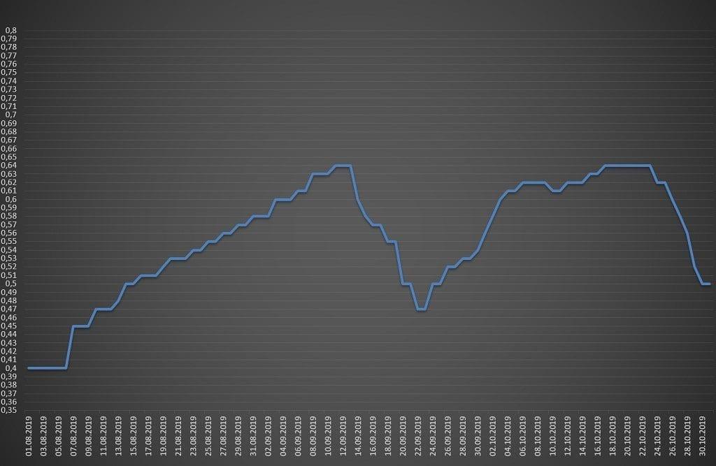 Śledząc ten wykres można zauważyć kilka istotnych kwestii. Po pierwsze, maksymalne ceny są na tym samym poziomie. Cena dla sadownika, na skupie nie przekraczała tej jesieni 0,63 – 0,64 zł/kg. Oznacza to, że poziomem, którego żadna przetwórnia nie przekroczyła przez całą jesień, było 0,70 zł/kg loco zakład.