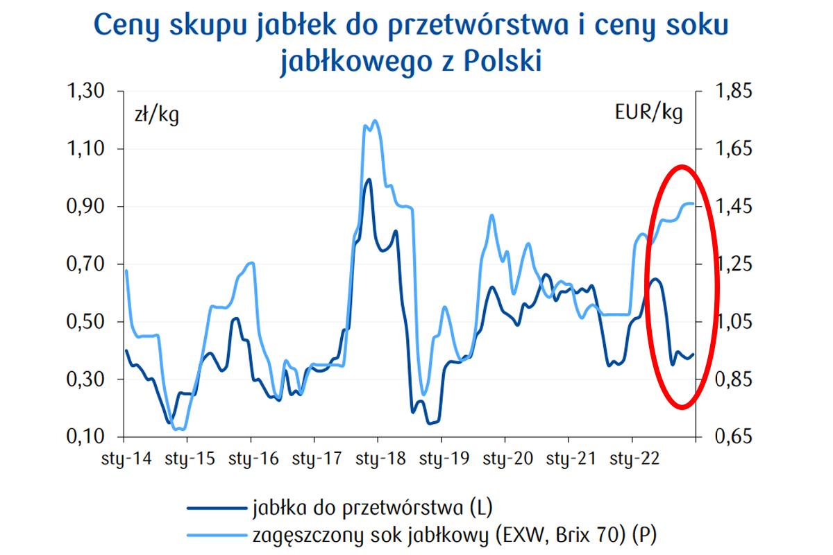 Warto zwrócić uwagę na fakt, o którym informowaliśmy w tym sezonie wielokrotnie. Chodzi o przerzucenie rosnących kosztów produkcji na sadowników. Świetnie prezentuje to wykres sporządzony przez analityków PKO BP. W zaznaczonym miejscu widzimy, jak ceny skupu surowca i ceny sprzedaży koncentratu jabłkowego wyraźnie się „rozjeżdżają”. Od wielu tygodni polski koncentrat jest eksportowany po 1,45 eur/kg (6,77 zł/kg). Zatem jest to najwyższa cena od 6 lat z wyjątkiem „przymrozkowego” sezonu 2017/2018.