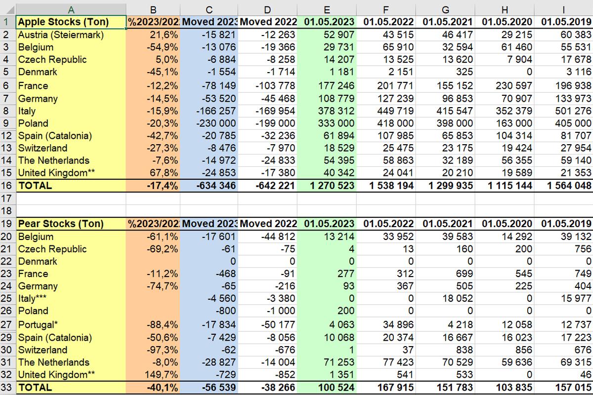 Tym razem najwięcej jabłek w swoich chłodniach mają znowu Włosi (378 tysięcy ton). Analizując tempo sprzedaży jest prawdopodobne, że w nowy sezon wejdziemy bez owoców z 2022 roku. Odpowiedź na pytanie o rekordowo wysokie ceny gruszek również znajdziemy w statystykach WAPA. Owoców gatunku w całej Europie jest o 40% mniej niż przed rokiem.
